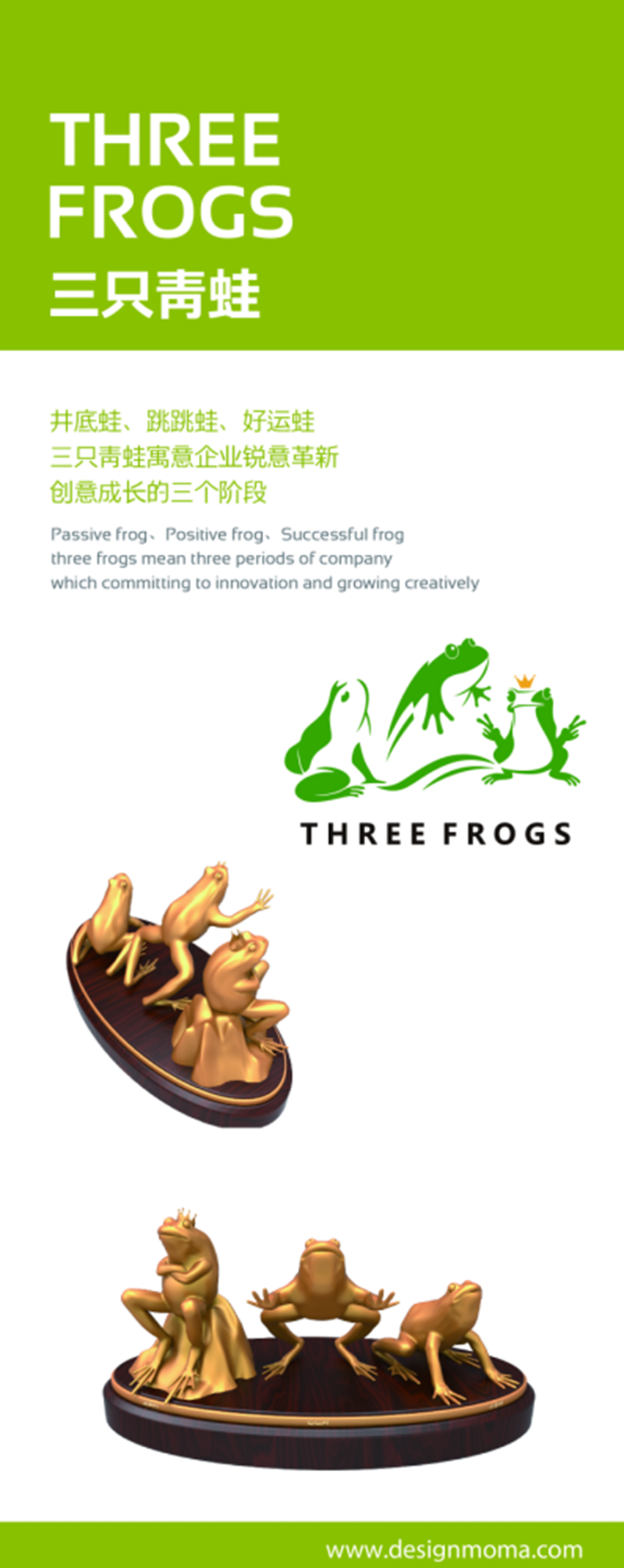 “井底蛙”、“跳跳蛙”、“好運蛙”三只青蛙寓意企業銳意革新創意成長的三個階段。