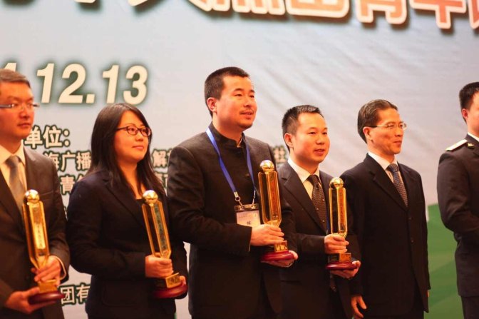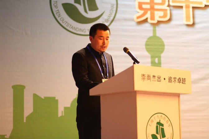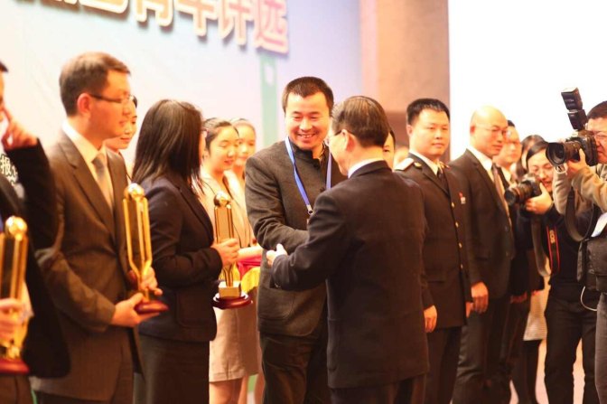 丁偉從全國政協(xié)常委、上海市政協(xié)副主席周漢民領(lǐng)導手中接過這意義深刻的獎杯