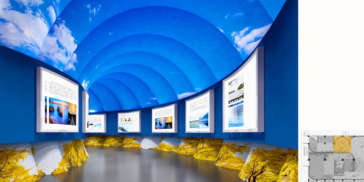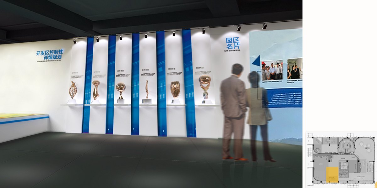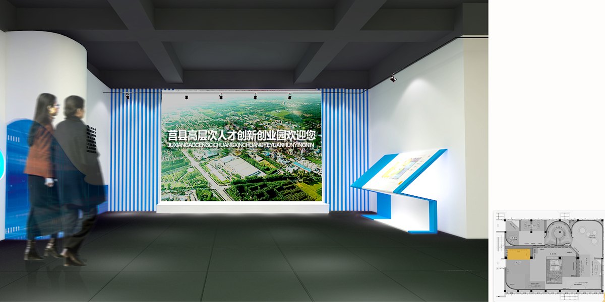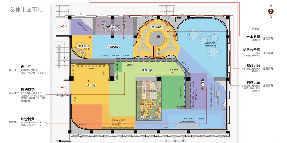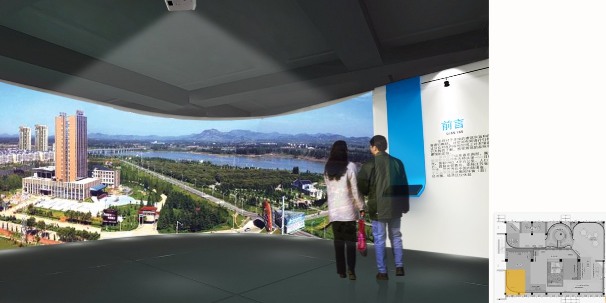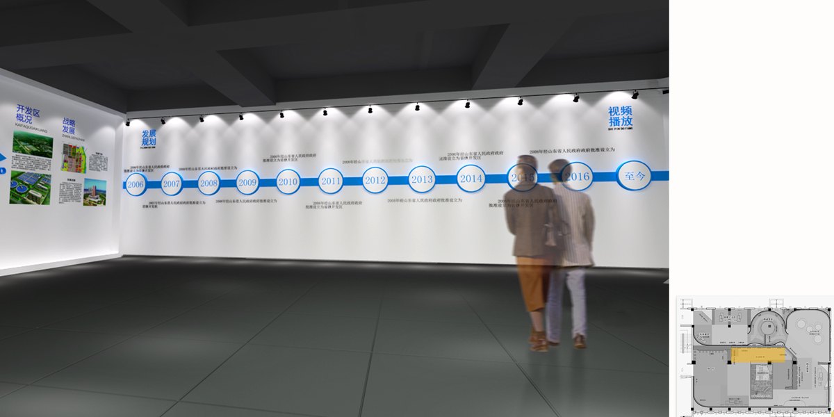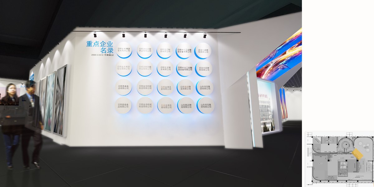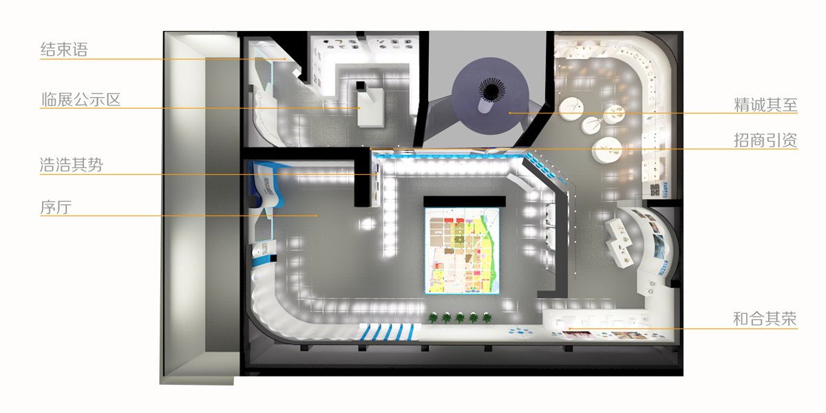 設計以“莒國文化”和“高層次產業”為創意理念來源,并將其作為展示的主要脈絡。空間流線構成為序廳、浩浩其勢、和合其榮、精誠其至、未來展望等七個部分,瀏覽路線清晰且融合,相互共生。動線規劃始終圍繞內容的有效傳遞和情境體驗展開。