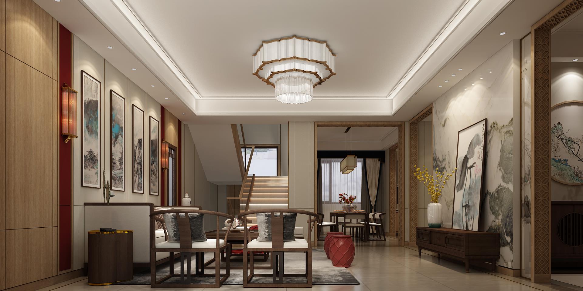 玄關與客廳均大面積選用木制家具,彰顯千年傳承的韻味,洋洋灑灑的中國紅驚艷而醇厚,燦爛而極致,搭配古韻十足的吊燈、地毯與背景墻等元素,打造出一個人文雅致、安然舒適的新中式主題空間。餐桌上精心選用的餐具與擺件古色古香,營造出蘊含東方文化的意境空間。